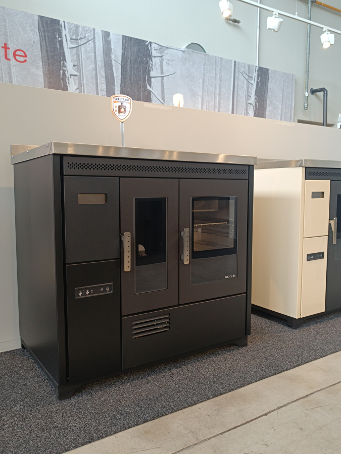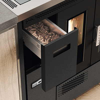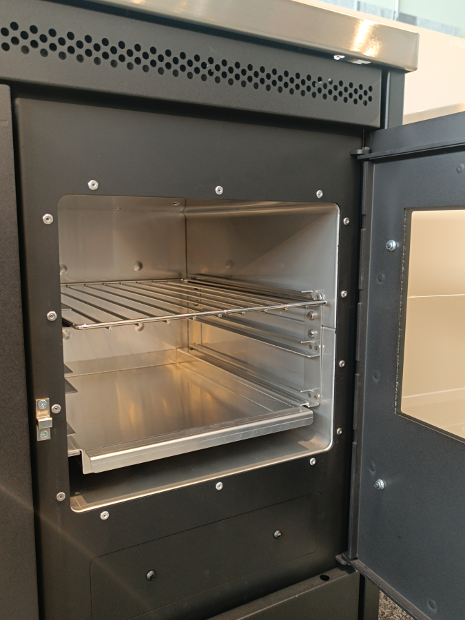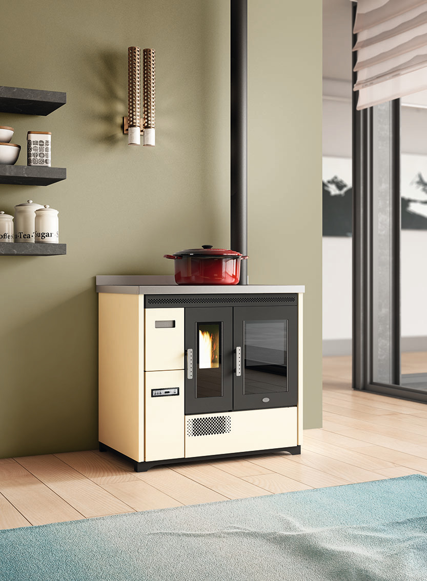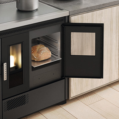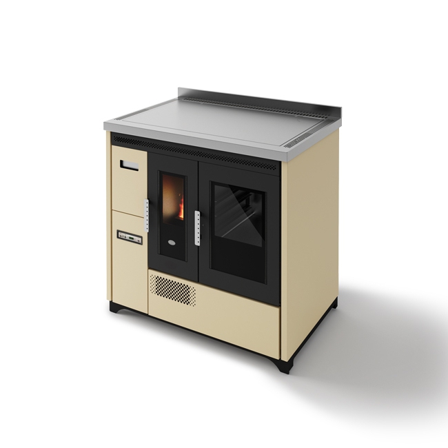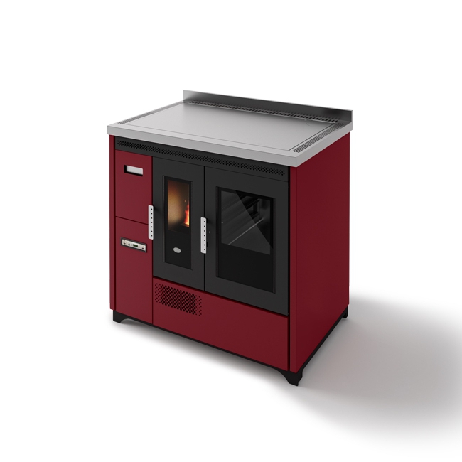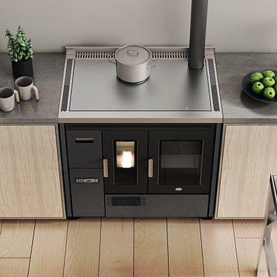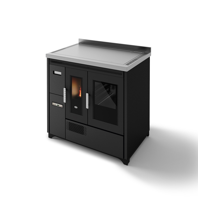 Egy gazdaságos pellet kályha hitelesített sütővel. Köszönhetően a pellet töltéshez kényelmes elülső fióknak, az óriási acél főzőlap (90 cm) teljesen kihasználható. Az elektromos rendszere lehetővé teszi a kályhának, hogy a szobában kívánt hőmérsékletnek megfelelően legyen beállítva, ugyanígy a sütő hőmérséklete is állítható (120 és 240 °C között).
