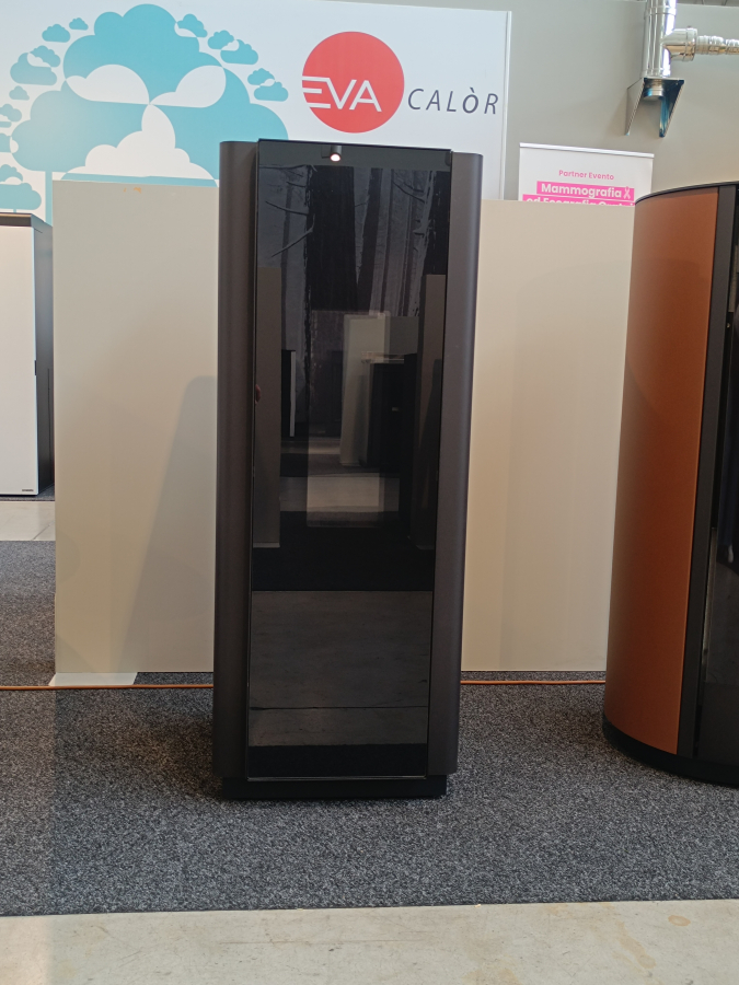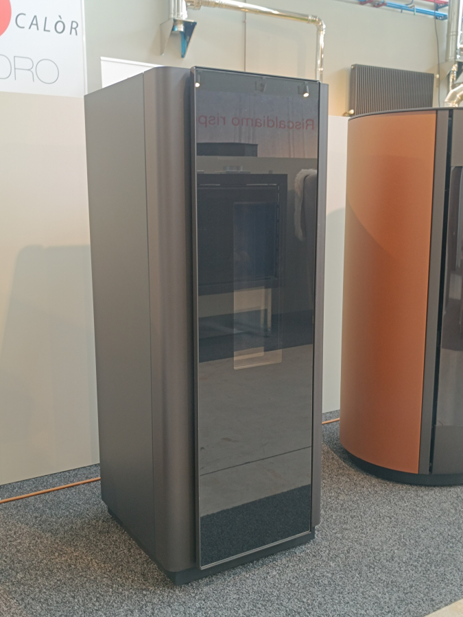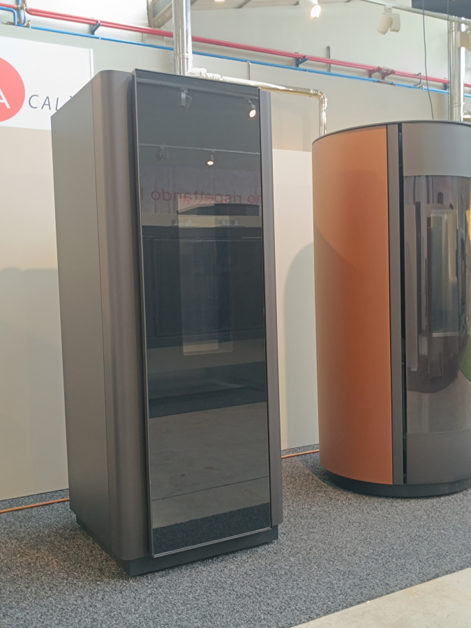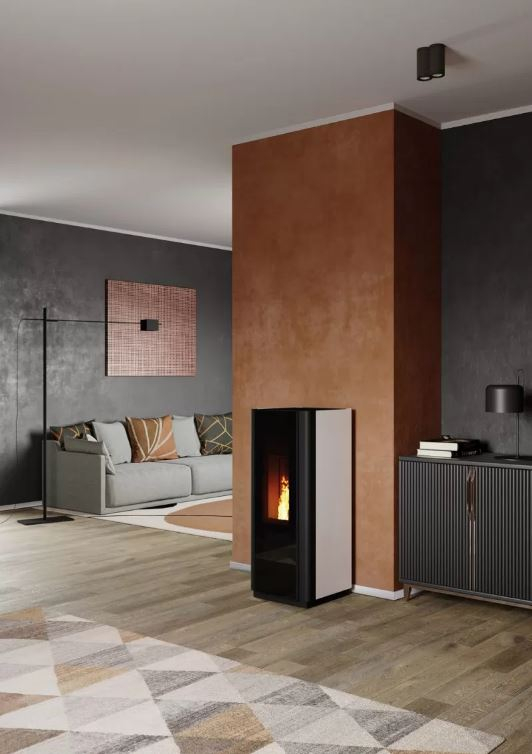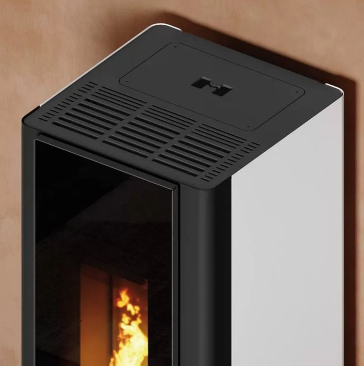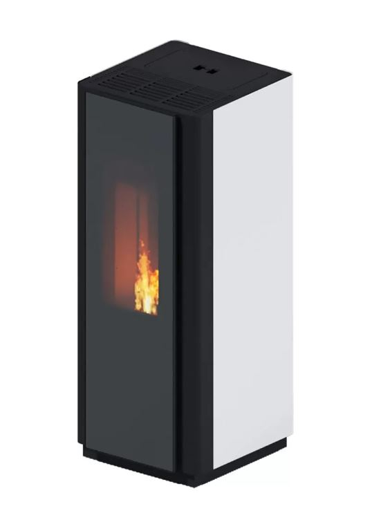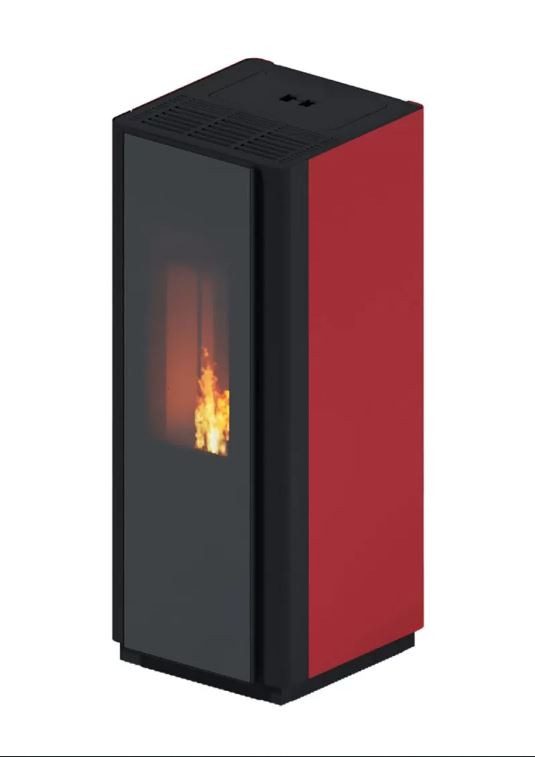 Kézzel modellezett és kivitelezett, festett acél bevonatú pellet kályha.