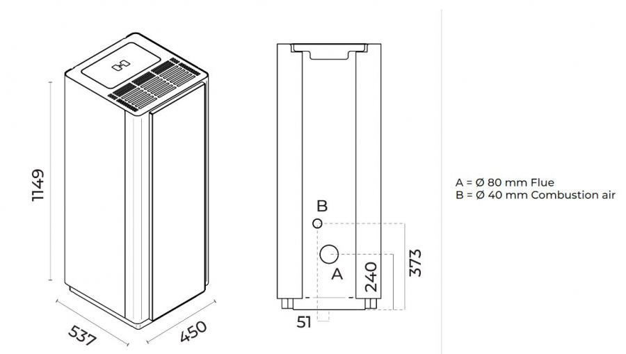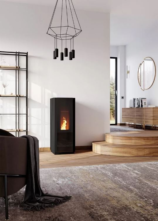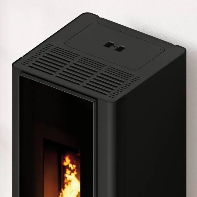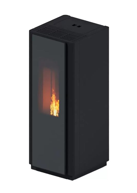 Kézzel modellezett és kivitelezett, festett acél bevonatú pellet kályha.