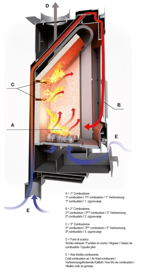Az Eva Calòr által kifejlesztett égési folyamat lehetővé teszi, hogy a lehető legtöbbet hozza ki a fa fűtő erejéből, miközben minimalizálja a mérgező kibocsátást. Az elvezetési módnak köszönhetően a felmelegített oxigén kétszer jut be az égéstérbe, így kétszer sikerül újragyújtania a fa égetésekor keletkező szén-monoxiddal terhelt füstöt. Ez optimalizálja a hőtermelést, miközben minimalizálja a károsanyag-kibocsátást és a fogyasztást.
